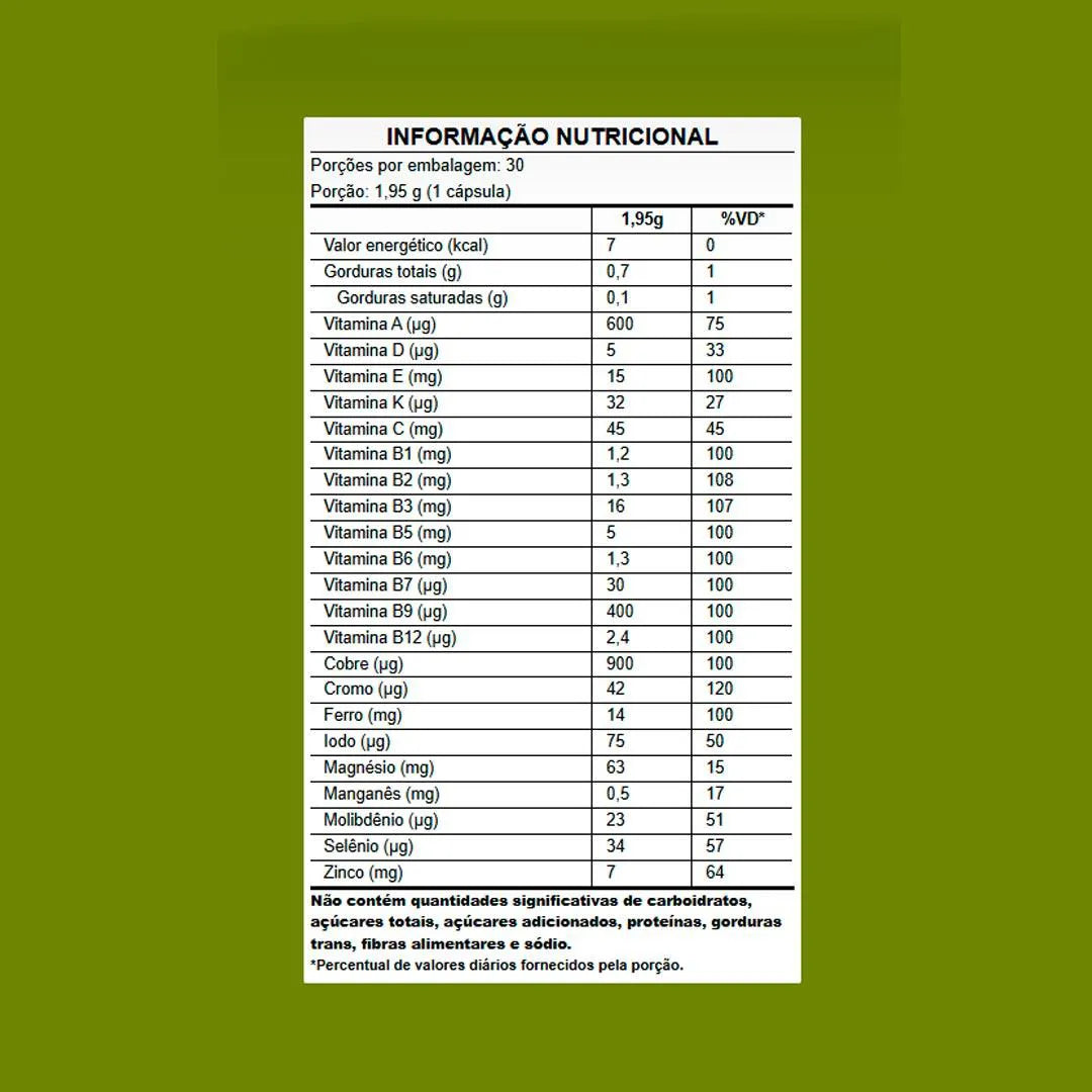 Ingredientes: vitaminas e minerais em formas biodisponíveis, minerais de alga marinha, antioxidantes naturais, cápsula vegetal.