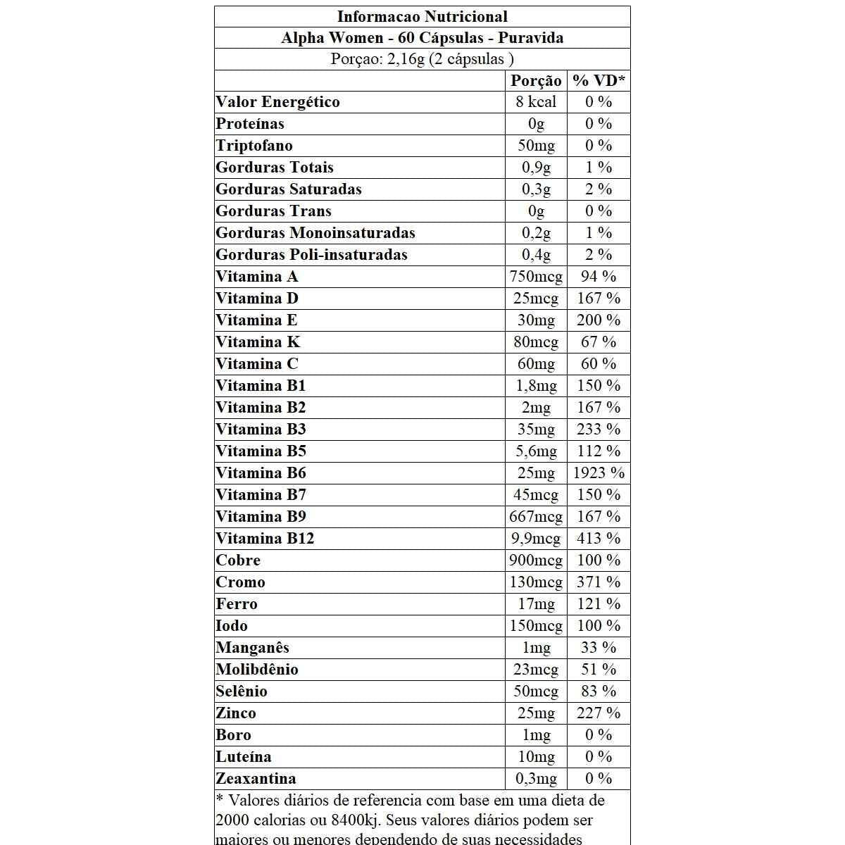 Energia, equilíbrio hormonal e beleza de dentro pra fora: o Alpha Women da Puravida é um multinutriente desenvolvido especialmente para a saúde da mulher, combinando vitaminas, minerais e extratos naturais que apoiam disposição, imunidade, equilíbrio hormonal, pele, cabelo e unhas.