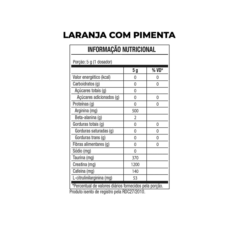 Como usar: recomenda-se 1 scoop (aproximadamente 5 g) diluído em 200 ml de água, 30 minutos antes do treino. O consumo deve ser ajustado conforme a tolerância individual à cafeína e ao tipo de atividade física. Evitar o uso no período noturno para não interferir no sono.