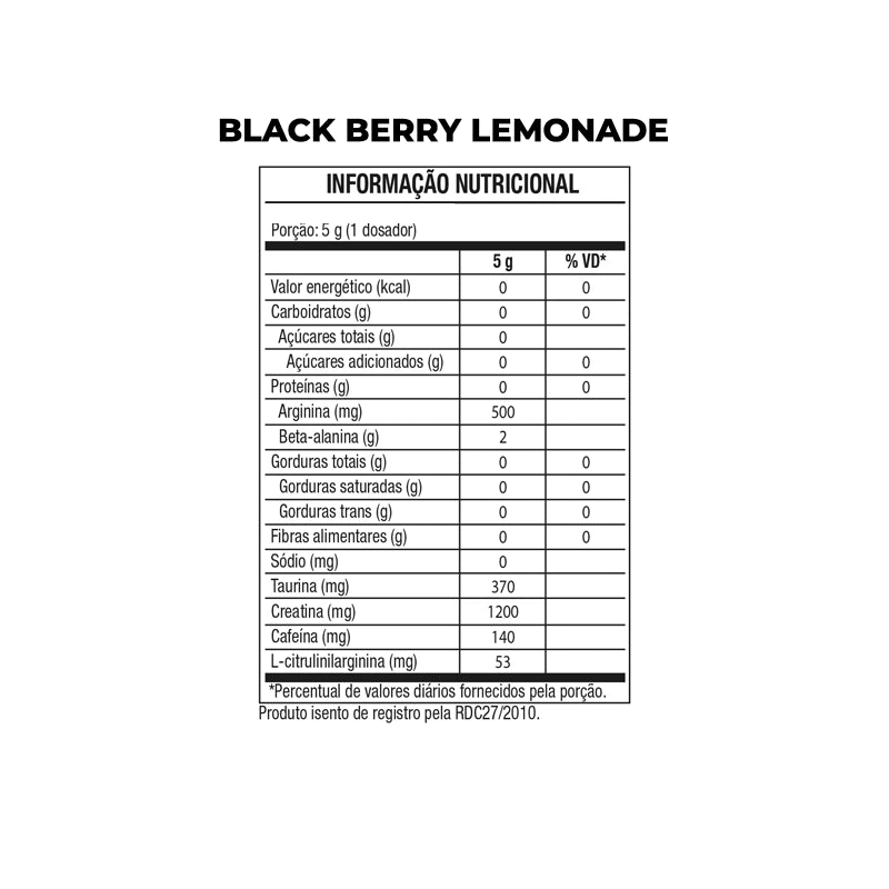 Ingredientes principais: beta-alanina, arginina, taurina, cafeína anidra, aromatizantes, acidulante ácido cítrico, corantes e edulcorantes.