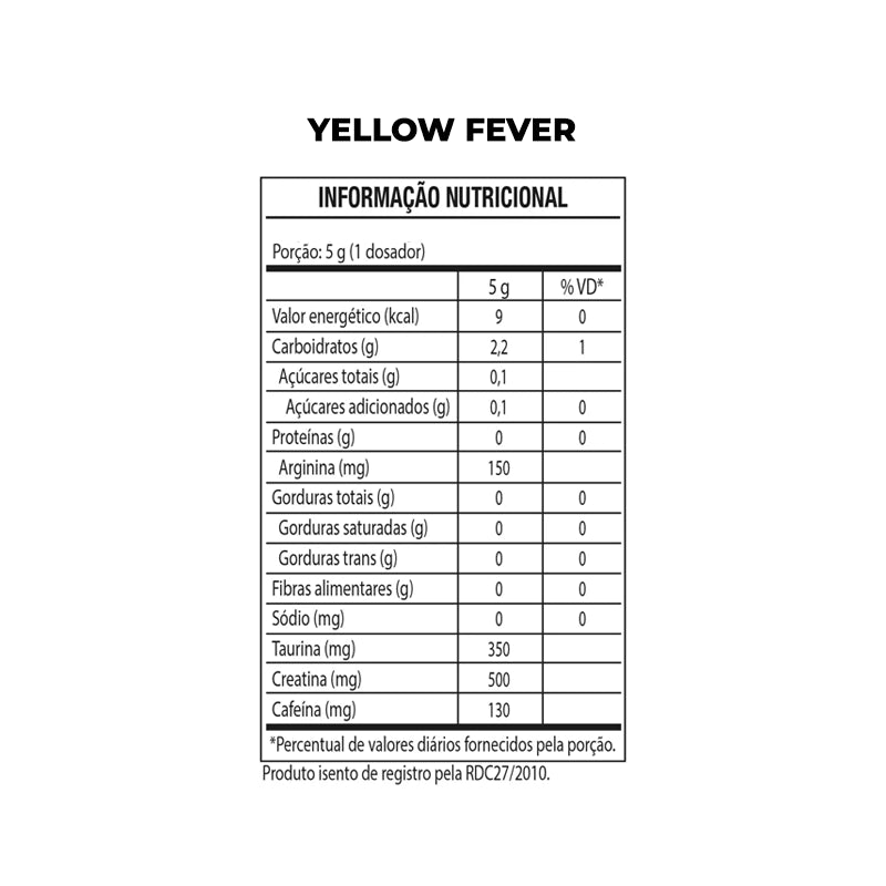 Ingredientes principais: beta-alanina, arginina, taurina, cafeína anidra, aromatizantes, acidulante ácido cítrico, corantes e edulcorantes.