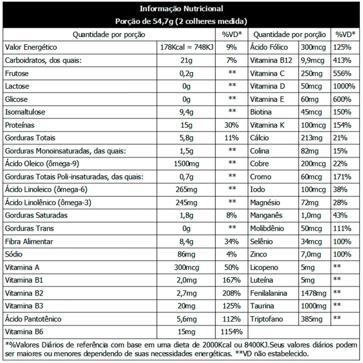Misturar 1 porção (≈ 35 g – 1 colher-medida padrão) em 200–250 ml de água ou bebida vegetal, e consumir 1 a 2 vezes ao dia, conforme necessidade energética ou orientação de nutricionista. Ideal como substituto de refeição ou lanche reforçado.