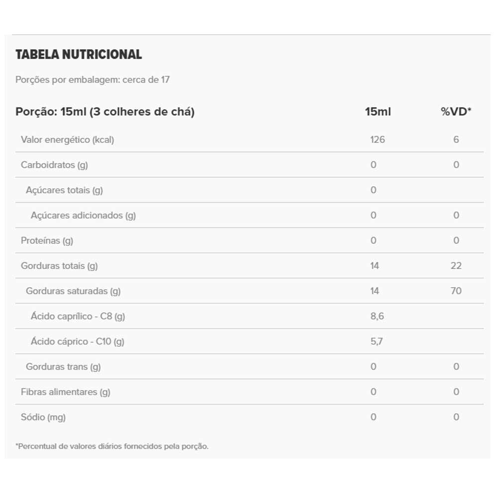 Composição: triglicerídeos de cadeia média (MCT) extraídos de óleo de coco, sem aditivos artificiais.