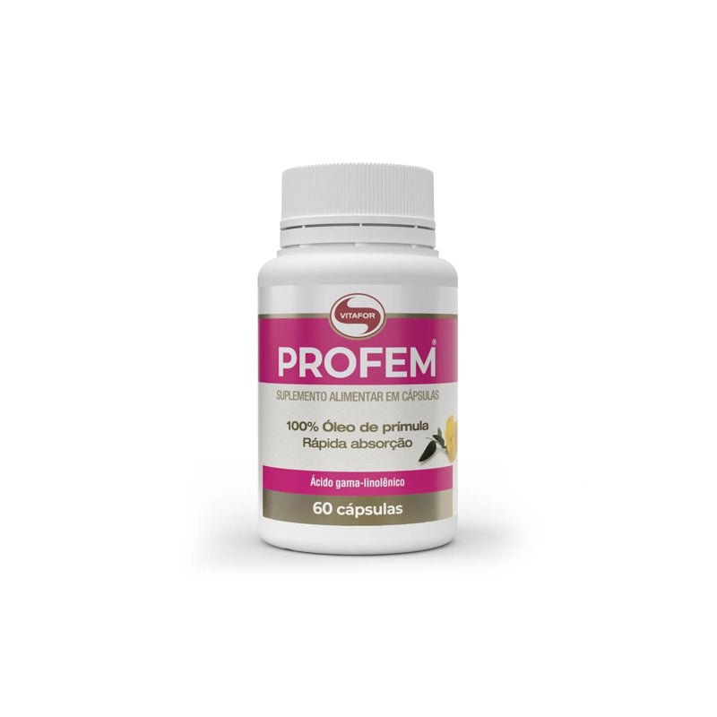 Equilíbrio hormonal e bem-estar feminino: o ProFem Óleo de Prímula 60 cápsulas da Vitafor é um suplemento natural rico em ácido gama-linolênico (GLA), um tipo de gordura essencial com ação anti-inflamatória e reguladora, muito usado para aliviar sintomas da TPM e menopausa.